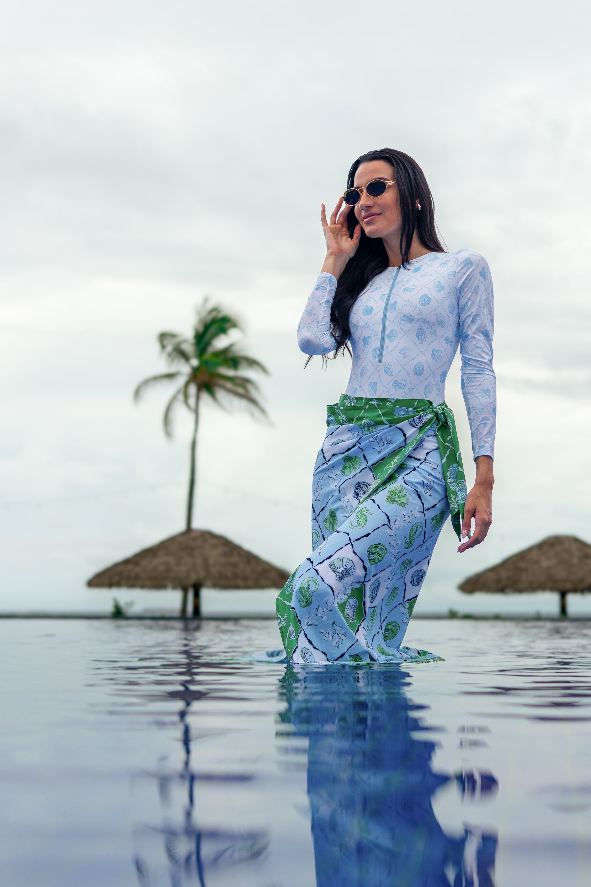 NAIA BLOOM Swim Duo Set. This white bodysuit captures the essence of a perfect beach day with its stunning coral and marine mosaic design. Built with chlorine-resistant fabric, it stays vibrant and fade-free through endless ocean adventures. The convenient back zipper closure and playful long sleeves offer flexibility for any water activity, while the matching tie-waist skirt adds a fun, flirty touch that takes your beach style from water to shore. Make every splash count. Bold, beautiful, and built to last—this is the duo that keeps up with your aquatic lifestyle.
